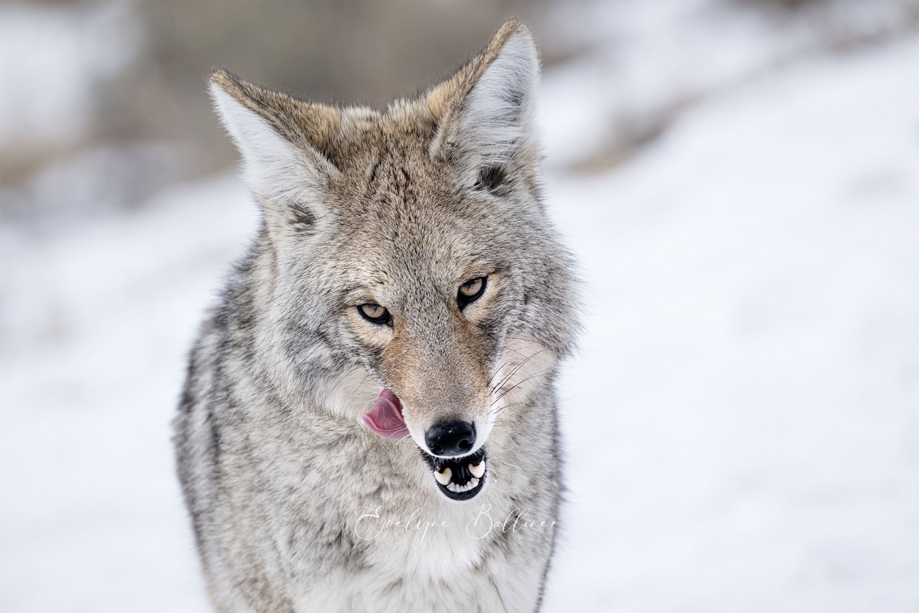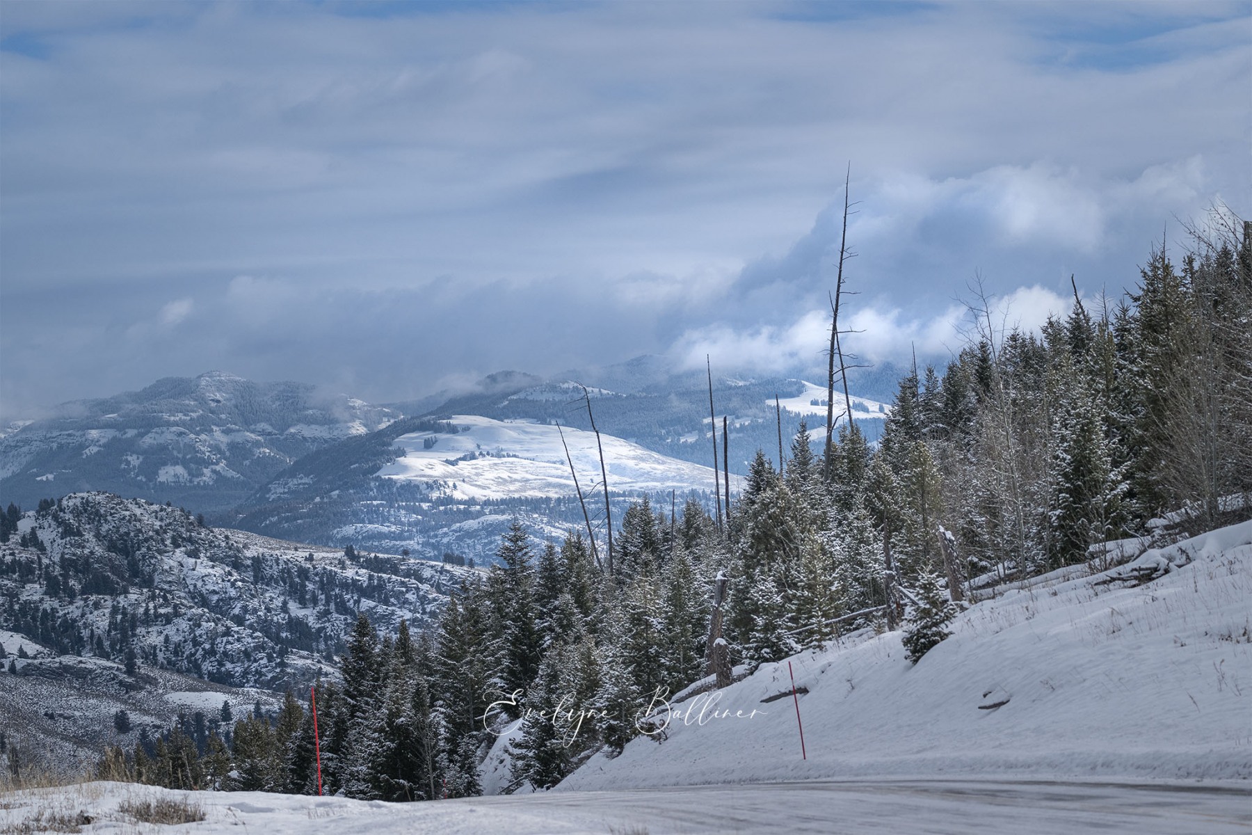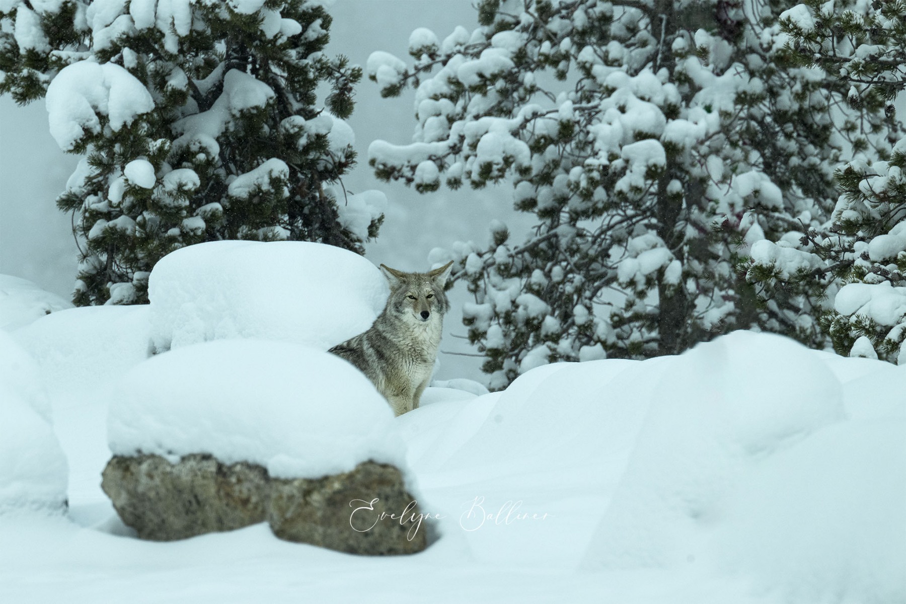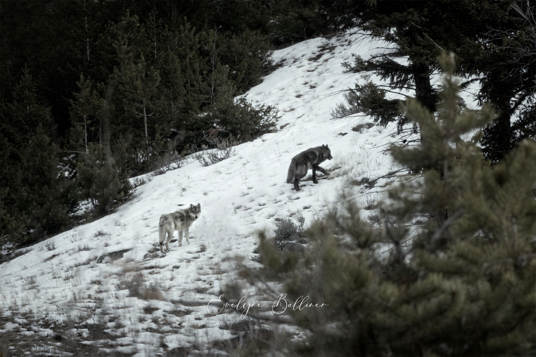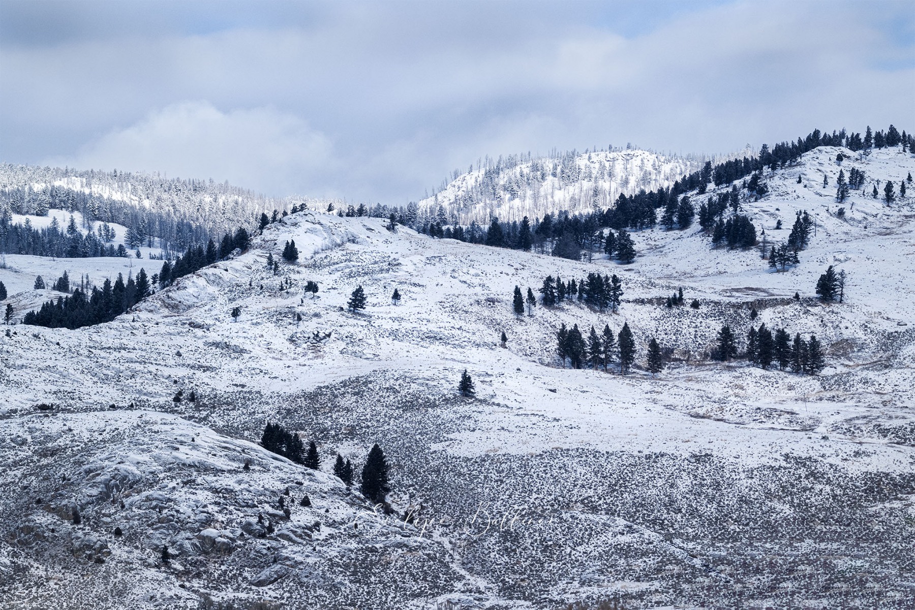 A la pointe du jour, dans le grand froid du matin, nous explorons le parc de Yellowstone. Durant l’hiver, de nombreuses routes sont fermées à cause de la neige. Cependant, la route qui traverse le parc d’ouest en est reste ouverte toute l’année. Elle suit la rivière Lamar au cœur de Lamar Valley. A cette saison, de nombreux herbivores (bisons, wapitis, antilopes pronghorn, entre autres) descendent dans la vallée, moins froide que les sommets du parc. Les prédateurs les suivent généralement. C’est la meilleure saison pour voir des loups le long de la rivière à la recherche d’une proie.