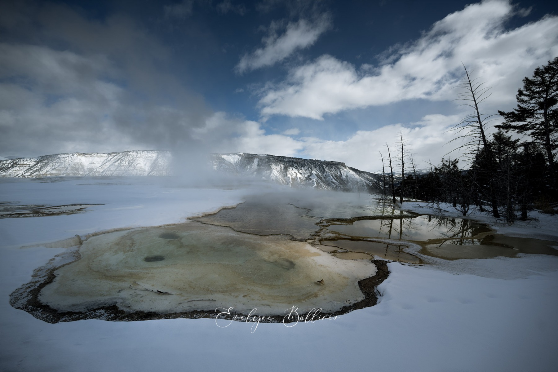 C’est à bord de cet engin magique que nous prenons la route vers le plus célèbre geyser du parc découvert en 1870 : Old Faithful. Il entre en activité toutes les 60 minutes et offre un spectacle à couper le souffle, ses eaux jaillissant à plus de 40 mètres. Nous pouvons peut-être y apercevoir des bisons dans le givre, des wapitis, des coyotes, des loups, des loutres et des lynx. A savoir que 67 espèces de mammifères cohabitent dans le parc. Grâce à la privatisation de notre véhicule tout terrain, la priorité est donnée aux arrêts fréquents pour photographier les magnifiques ambiances et les animaux rencontrés dans le parc. Nous passons l’après-midi à observer les geysers et les marmites qui font fondre la neige et laissent place à de jolies couleurs.ôt le lendemain matin, nous partons pour une balade à pied pour profiter de la belle lumière du début de journée. Nous avons de grandes chances de rencontrer des bisons prenant un peu de chaleur près des geysers. Les animaux étant très actifs le matin, nous avons la possibilité de réaliser de beaux clichés, avant de repartir à la mi-journée en snowcoach.